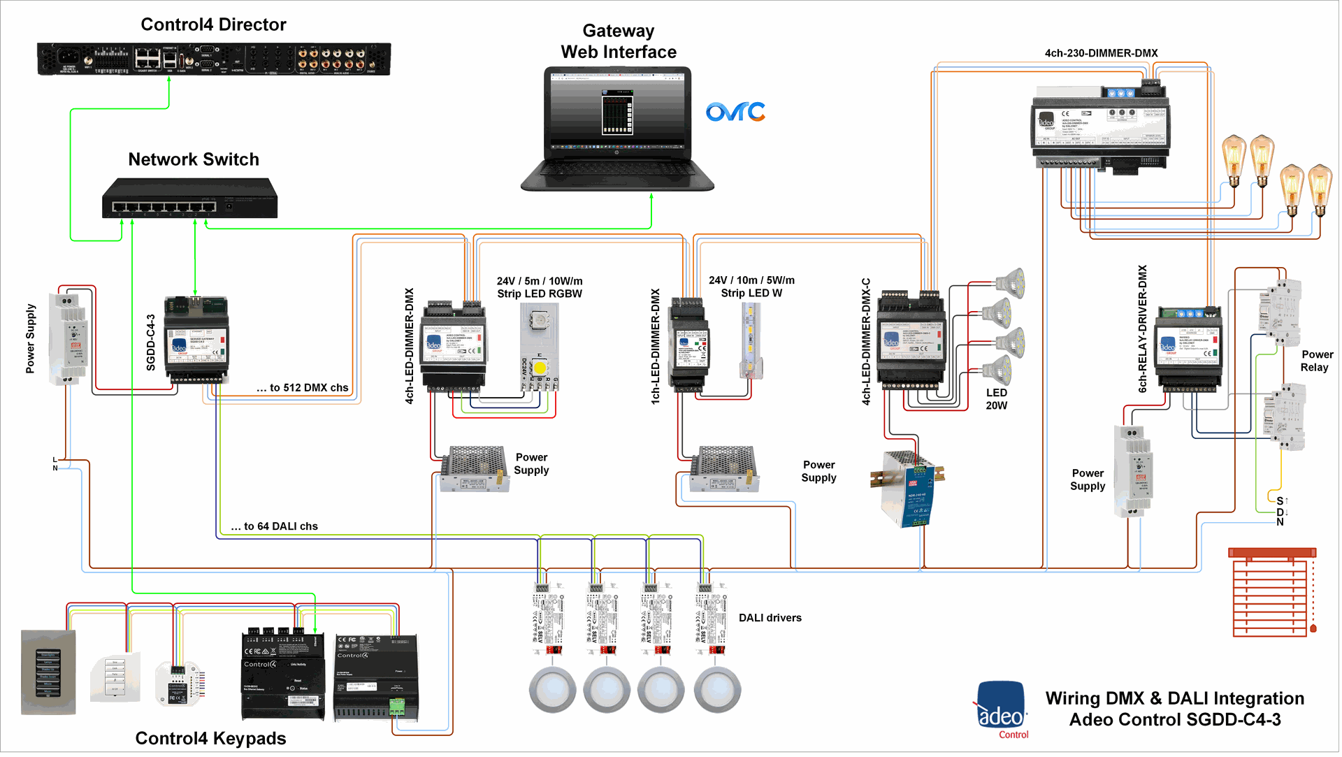 Server Gateway IP DALI & DMX (simultaneous), DALI addressing, free Control4 Drivers (Network, Dimming Light, HSV Color, RGB Switch and Relay), Support 512 connection (all DMX channels). 5 years warranty.